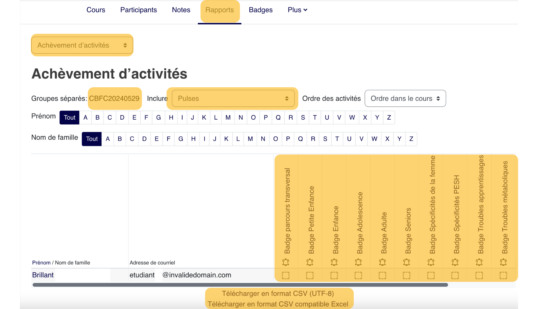 - Vérifier qui a obtenu le badge. Aller sur Rapports\Achèvement d’activités . La liste de votre groupe apparait. En orange les points importants: Dans la liste des activités, choisir le type "Pulse", pour afficher les badges. Accès aux badges