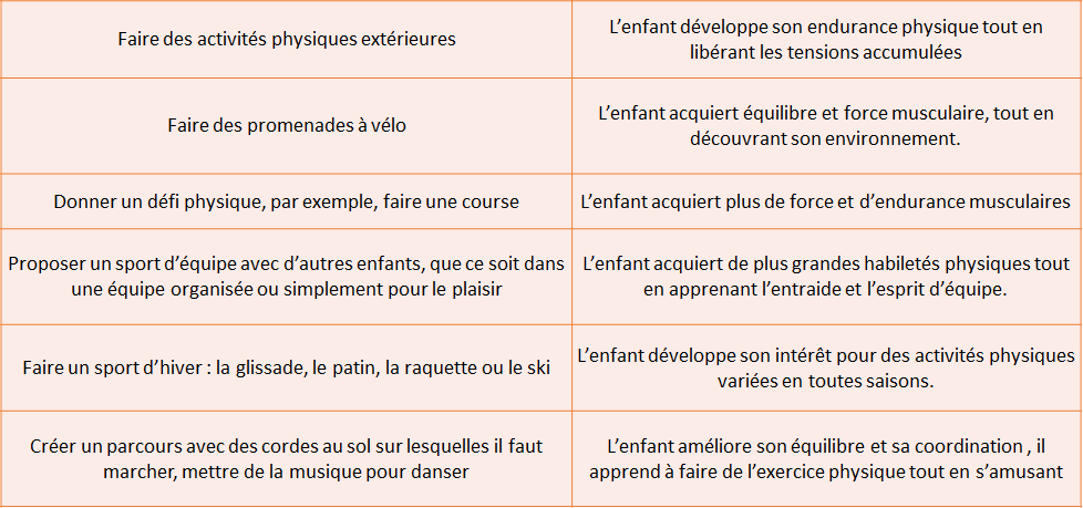 Ensemble “l’augmentation substantielle de la dépense d’énergie” recommandée par les autorités de santé publique, et la multiplication des expériences motrices nécessaires au développement psychomoteur, voire cognitif, de l’enfant, militent pour préconiser, au moins, une heure d’activité physique quotidienne, réalisée à des intensités les plus variées possible.