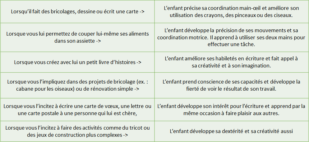 - La coordination des mouvements augmente (maîtrise des mouvements de l’écriture, manipulation de certains outils, exécution de certains mouvements gymniques, pratique de la danse...)
